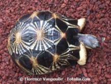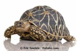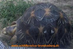 Astrochelys (Geochelone) radiata![]() ![]() Merkmale: • Größe: 40-45 cm, Männchen ca. 15 kg, Weibchen ca. 22 kg • der Carapax weist ein wunderschönes Strahlenmuster auf, hoch gewölbt mit senkrecht verlaufenden Marginalschilden, Grundfarbe schwarz mit leuchtenden, fächerförmigen, gelben Strahlen, die manchmal auch creme oder orange-weiß sind • für den Laien leicht zu verwechseln mit Geochelone elegans/platynota sowie Psammobates spp. • der Plastron bei den Männchen ist meistens konkav, dickeres Xiphiplastron • besitzt Nackenschild, kräftige, stumpfe Vorderbeine mit runden Schuppen, • die Kopfzeichnung ist zweifarbig braun-schwarz auf der Oberseite und unten gelb Vorkommen: • im Südwesten Madagaskars • sandige Böden mit dornigen Büschen, Baobabs und Akazien Haltung:*) • sandige bis lehmige Böden mit etwas Bewuchs, Steinen und Versteckmöglichkeiten (hohe Gräser) sowie Ästen oder Baumstumpen, am besten in einem großen Wintergarten oder Gewächshaus mit Freiland, Freiland nur in den Sommermonaten • pflanzliche Ernährung sowie Obst, gelegentlich auch Aas, Lieblingsfutter sind Opuntien, Gruppenhaltung empfohlen • Mindestanforderungen: Länge=PL x 8, Breite=1/2 der errechneten Länge • Trockenzeit: tagsüber 22-30 °C, nachts abgesenkt um 8-10 °C, lokaler Wärmespot ca. 40-45 °C, Luftfeuchtigkeit 40-60 % • Regenzeit: tagsüber 28-35 °C, nachts abgesenkt um 5-8 °C, lokaler Wärmespot zw. 35-40 °C, Luftfeuchtigkeit 60-100 %, täglich sprühen Vermehrung:*) • geschlechtsreif erst mit etwa 20 Jahren, die Paarung ist nie brutal und findet immer ohne Bisse nach Regenfällen statt, das Männchen umkreist das Weibchen, nickt mit dem Kopf und paart sich • Eiablage von September – März (im 6-8 Wochen Abstand), 8-22 Eier pro Gelege, die Eier sind rund und ca. 45x50 mm groß, Inkubationszeit von ca. 145-230 Tagen Hibernation: • Keine Winterstarre, keine Sommerruhe |