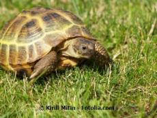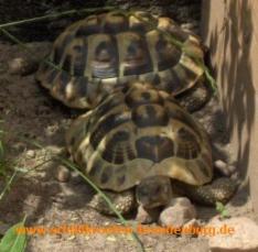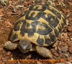 Testudo hermanni![]() Merkmale: • Größe: Männchen ca. 19 cm/ca. 1 kg und Weibchen ca. 25-28 cm/ca. 1,5-2 kg • der Carapax ist glänzend, kräftig gelb bis orangefarben (manchmal auch grünlich) mit schwarzer Zeichnung, jedes Schild auf der Areole sowie am Rand hat eine regelmäßige Zeichnung, Panzer mäßig gewölbt, oft wird die Zeichnung über dem Schwanzschild auch als „Schlüssellochzeichnung“ bezeichnet • Hornnagel am Schwanzende (bei männlichen Exemplare besonders kräftig), geteiltes Schwanzschild, der Plastron hat zwei breite durchgehende schwarze Bänder, die Mittelnaht der Brustschilde ist kürzer als die der Schenkelschilde • Schenkelsporne fehlen, meistens ein gelber Fleck unterhalb der Augen • Die Männchen sind im hinteren Panzerbereich meistens breiter (Dreieckform), manchmal auch mit hochgezogenen Marginalschildern Vorkommen: • westliches und südliches Italien, im Südosten Frankreichs, im Norden Spaniens sowie auf den Balearen-Inseln Mallorca, Menorca und auf Korsika, Sizilien, Sardinien • lebt in der Garrigue, der Macchia, in offenen Wäldern der mediterranen Gebiete, halboffene Lebensräume mit Schatten und Verstecke aber auch offene Gegenden für das Sonnenbad und der Eiablage Haltung: • überwiegend Freilandhaltung mit Schutzhaus, Sonnenplatz und schattenspendende Gewächse • tagsüber 25-30 °C, nachts abgesenkt um ca. 10 °C, lokaler Wärmespot ca. 35-45 °C, Luftfeuchtigkeit von 40-60 % • Mindestanforderungen: Länge=PL x 8, Breite=1/2 der errechneten Länge • vegetarische Ernährung, Gruppenhaltung empfohlen Vermehrung: • Klassische Paarung mit Rammstößen • Eiablage von ca. Mai – August, etwa 1-5 Eier pro Gelege oder mehr, die Eier sind oval und ca. 32x24 mm groß, die Inkubationszeit beträgt ca. 50-90 Tage • Geschlechtsreife bei Männchen mit ca. 8-12 Jahren, Weibchen 10-14 Jahren Hibernation: • Winterstarre von ca. November/Dezember bis Anfang März bei 4-6 °C |