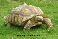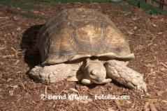 Centrochelys (Geochelone) sulcata![]() ![]() Merkmale: • Männchen ca. 98 kg, Weibchen ca. 60 kg, Carapax bis 100 cm und mehr • besitzt den größten Gularschild, der gabelförmig nach vorn ragt, der Carapax ist meistens lang, oval bis quadratisch und flach, gelb bis orangefarben, gelblich-beigefarben oder einheitlich cremefarben, manchmal ein leichter Stich ins Braune, das Plastron beim Männchen kann eine Einbuchtung bis 12 cm aufweisen, das Xiphiplastron ist sehr dick, die Marginalschilde auf der Höhe der Vorderbeine verformen sich mit zunehmenden Alter nach außen, die Marginalschilde hinten sind gezahnt – wie Schmetterlingsflügel, allgemein ist das Plastron gleichfarben zum Carapax, der Carapax beim Weibchen bleibt rund, Vorderbeine sind stark beschuppt, Oberschenkel haben zahlreiche und lange Sporne, kräftiger Kopf Vorkommen: • im Süden von Mauretanien, im Nordosten Senegals (Sahelzone), im Süden von Mali, im Nordosten des Tschad, im Westen/Nordosten des Sudan, im Norden von Eritrea, im Nordosten Äthiopiens • lebt in den trockensten Biotopen, sandige Böden, kaum Niederschlag, trockene und dornenreiche Vegetation (Sträucher, Akazien, Baobabs), gräbt bis 15 m lange Höhlen Haltung: • grobkörniger Sand sowie Lehm und Steine, viele Äste und Verstecke, am besten in einem sehr großen Wintergarten, Gewächshaus oder Raum mit Freiland zu halten, Freiland nur in den Sommermonaten • Mindestanforderungen: Länge=PL x 8, Breite=1/2 der errechneten Länge • Trockenzeit (November-Juni): tagsüber 25-35 °C, nachts abgesenkt um 15 °C, lokaler Wärmespot ca. 38-45 °C, Luftfeuchtigkeit 40-60 % • Regenzeit (Juli/August): tagsüber 28-35 °C, nachts abgesenkt um 10-12 °C, lokaler Wärmespot ca. 28-45 °C, Luftfeuchtigkeit 60-100 % • Gruppenhaltung empfohlen, opportunistische Ernährung, gelegentlich Aas Vermehrung: • heftige Rammstöße, dann klassische Paarung im Herbst nach der Regenzeit, Eiablage ca. November bis Ende Mai, bis zu 13-31 fast runde Eier pro Gelege, Inkubationszeit ca. 120 Tage Hibernation: • keine Winterstarre, stundenweise Sommerruhe in Höhlen |