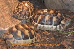 Agrionemys (Testudo) horsfieldii![]() ![]() Merkmale: • Größe: Männchen ca. 18 cm, Weibchen ca. 20 - höchstens 28 cm • kieselartiger, recht flacher aber runder Carapax, der einheitlich braun bis rötlich gefärbt, manchmal auch leicht grünlich ist, die Marginalschilde sind mit dem Plastron verbunden, die Areolen sind manchmal etwas dunkler (besonders bei Jungtieren) • besonderes Merkmal sind die nur 4 Zehen an den Vorderfüßen (daher auch gern Vierzehen- schildkröte genannt), die Krallen sind ziemlich breit und schaufelförmig • der Plastron ist oval mit großen schwarzen Flecken und hellen Nährten; bei älteren Tieren meistens einfarbig braun • relativ lange Beine, mit denen sie sich rasch bewegt • nur etwas 4-5 Monate im Jahr aktiv Vorkommen: • westliches Iran bis China, nördliches Russland über den Golf von Oman und südliches Pakistan, Anrainerstatten des Schwarzen Meeres, unbeständig in Neapel, Kasachstan und Usbekistan • trockene, oftmals wüstenähnliche Steppen in Höhen bis zu 2500 m, sehr heiße Sommer und kalte, harte Winter Haltung: • Freilandhaltung nur in den Sommermonaten (Mai-September) mit Schutzhaus, Sonnenplatz und schattenspendende Gewächse, unterirdische Einfriedung sollte sehr tief sein, da die A. horsfieldii gern und sehr tief gräbt, trockene Haltung empfohlen, da Wüsten- und Steppenbewohner; verträgt keine „feuchte“ Haltung, Höhlenbewohner, bevorzugt sandig-lehmige Böden • Mindestanforderungen: Länge=PL x 8, Breite=1/2 der errechneten Länge • tagsüber 22-28 °C, nachts abgesenkt um ca. 5 °C, lokaler Wärmespot ca. 40-45 °C • vegetarische Ernährung, manchmal auch Aas, Gruppenhaltung empfohlen, lebt aber eher als Einzelgänger Vermehrung: • heftiges, aber klassisches Paarungsritual mit Bissen um März/April • Eiablage bis Ende Mai (ca. 6 Wochen nach Paarung) zwischen 1-5 Eier pro Gelege, die Eier sind oval und ca. 26x45 mm groß, Inkubationszeit von ca. 60-100 Tagen Hibernation: • Sommerruhe von ca. Juni-August • Winterstarre von ca. September bis Mitte März bei 6 °C |