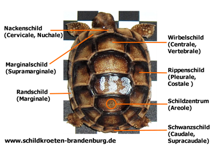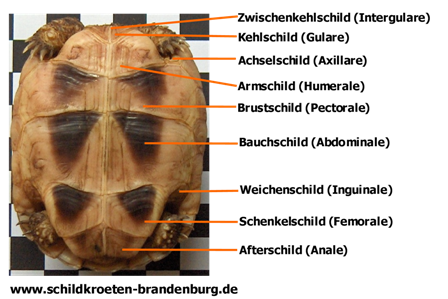 Der gesamte Panzer besteht aus dem Rückenpanzer (Carapax) und dem Bauchpanzer (Plastron). Beide Teile sind seitlich miteinander verbunden. Unter dem Carapax - also unter den sichtbaren Hornschilden – befinden sich Hautknochenplatten. Diese sind durch Knochennähte verbunden und stimmen in Form, Anordnung und Anzahl nicht mit den Hornschilden überein. Erst unter den Hautknochenplatten folgt dann das übliche Skelett mit der Wirbelsäule, Rippen sowie dem Schulter- und dem Beckengürtel.