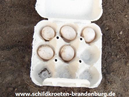 Am besten man markiert die Eier noch in der freigelegten Grube mit einem weichen Bleistift am obersten Punkt des Eies. Achtung, die Eier dürfen nur unmittelbar nach der Eiablage noch in ihrer Lage verändert werden. Findet man die Eier erst später, dürfen diese keineswegs in der Lage verändert (gedreht oder gewendet) werden, da sonst der Dottersack über die Keimscheibe rutschen kann und dies zum sicheren Absterben des Embryos führt! Die Eier werden dann nach und nach in den vorbereiteten Behälter gelegt und in den Inkubator überführt.