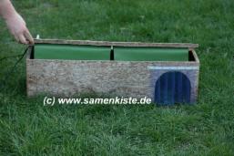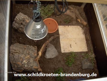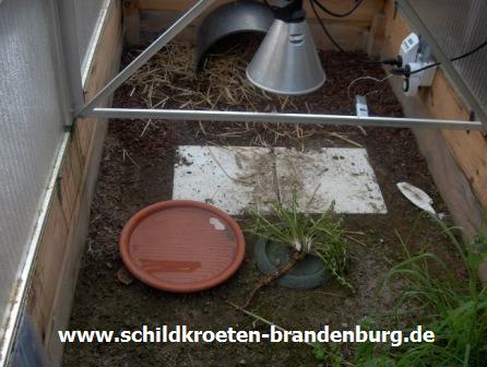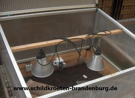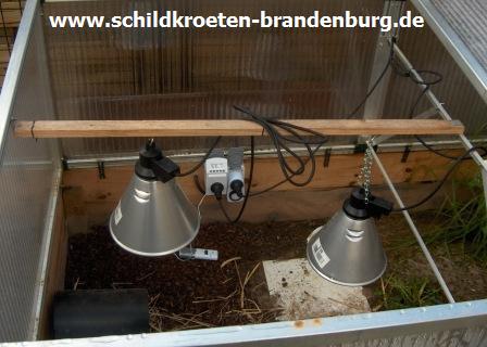 Im Frühbeet wird eine Querstange befestigt, an der die Reflektoren angebracht werden. Es ist wieder zu beachten, dass verschiedene Klimazonen geschaffen werden. Schildkröten benötigen auch im Freiland unterschiedliche Zonen nach Temperatur und Bodenfeuchte.