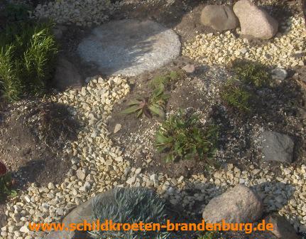 Orientiert man sich am natürlichen Lebensraum, so ist der Boden sehr kalkhaltig, steinig und oftmals sandig. Es sollte möglichst keine Rasenfläche sein, sondern natürlicher Gartenboden, der ungedüngt ist. Es empfiehlt sich, die obere Gartenschicht auszuheben und damit das Gelände zu modellieren. Hiermit können diverse Wege, Hügel und Senken geschaffen werden. Danach kann eine Sand-/Kiesschicht und Kalksteinbruch oder Dolomitkalk (z. B. Hornbach) aufgebracht werden. Der Dolomitkalk sollte dann nochmal mit einer dünnen Schicht Gartenerde bedeckt werden. Man kann auch Steinmehl verwenden. Weiterhin kann auch teilweise Muschelgrit verteilt werden, den ich meistens um die Pflanzen verstreue. Schildkröten fressen diesen sehr gern und haben damit eine weitere, natürliche Kalziumquelle.