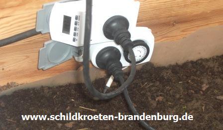 Das Einstellen der Technik richtet sich in erster Linie nach der Jahreszeit, deren Temperaturen und der Aktivitätsphase der Schildkröten. Hierbei ist bei der Einstellung der Technik zu unterscheiden, ob die Schildkröten nach der Winterstarre bereits im Übergangsterrarium waren, demnach wach und bereits aufgewärmt sind oder ob diese während der Starre ins Frühbeet überführt werden, um selbstständig Aufzuwachen oder ob die Tiere im Frühbeet überwintert haben und noch starren. Weiterhin ist auch zu bedenken, ob im Sommer oder sogar erst im Herbst ein Tier als Neuankömmling hinzukommt. Je nachdem ist die Einstellung vorzunehmen und der Jahreszeit schrittweise anzupassen (zu erhöhen). Im Herbst sollte auch die Rubrik Hibernation gelesen werden, da dann die Zeiten und die Temperaturen nach und nach minimiert werden. Bitte auch die Zeitumstellung im Frühjahr (März) bedenken. Um die Schildkröten nicht zu verwirren, gleich von Anfang an auf die neue Zeit die Technik einstellen.