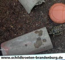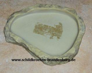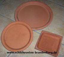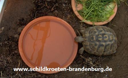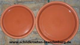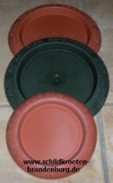 Weiterhin empfehle ich Untersetzer aus Terrakotta, da diese sehr hübsch und natürlich aussehen. Bei kleineren Schildkröten verwende ich unglasierte Untersetzer, die eine eher raue Oberfläche haben, damit die kleinen Schildkröten nicht ab- oder ausrutschen und die Gefahr des Ertrinkens minimiert wird. Außerdem sollten die Gefäße am Rand flach sein, damit jeder Schildkröte diesen einfach überklettern kann. Nur meine subadulten und adulten Tiere haben glasierte Terrakotta-Untersetzer, die sich erheblich leichter reinigen lassen. Ich reinige die Schalen unter klarem Wasser mit Hilfe eines Schwammes und trockne diese an der Sonne. Somit sind sie auch gleich „desinfiziert“ ohne das chemische Mittel verwendet werden.