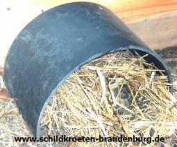 Im Frühbeet muss stets eine Wasserschale vorhanden sein, damit die Tiere immer eine Trink- und Bademöglichkeit haben. Dies ist besonders wichtig, wenn das Wetter schlecht ist und die Tiere nicht ins Freiland können. Besonders im Frühjahr gibt es noch kalte Tage, an denen unsere Tiere im Frühbeet bleiben müssen, dennoch darf es an nichts mangeln. Hier empfehle ich flache Gefäße, wie Blumenuntersetzer oder Schalen aus Kunststoff, Polyharz oder Terrakotta, die der Größe des Tieres entsprechen. Dies heißt, auch das größte Tier muss Platz zum Baden und Trinken haben, jedoch darf das kleinste Tier nicht darin ertrinken. Wer das Abkoten im Trinkgefäß vermeiden möchte, kann auch eine Stülptränke verwenden. Aus dieser kann dann aber nur getrunken werden und ein weiteres Gefäß zum Baden muss bereit gestellt werden. Beim Anbieten von Heu kann dieses auch in Futtertrögen gereicht werden. Der Vorteil besteht darin, dass das Heu nicht direkt in Berührung mit dem feuchten Boden kommt, somit nicht so schnell schimmelt und es kann durch Kot und Urin nicht verschmutzt werden.