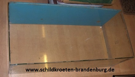 Eine recht gute Behausung für die kälteren Jahreszeiten, kranke oder in Quarantäne gehaltene Schildkröten sind einfache Aquarien. Diese sind oben offen, aber allerdings auch aus Vollglas und relativ hoch, was nicht unbedingt benötigt wird. Hier bleibt nur die Möglichkeit, den unteren Teil von ca. 20 cm rundherum von außen abzukleben, damit die Schildkröten sie als Begrenzung erkennen. Hierzu eignen sich z. B. selbstklebende Folien, wie sie zur Möbelrestaurierung benutzt werden. Käuflich sind diese in jedem Baumarkt zu erwerben. Eine Abklebung mit einfachen Papier und Klebestreifen tut es notfalls auch – Hauptsache es ist nicht mehr transparent. Man kann den oberen Teil auch mit einer Gitterabdeckung versehen. Es muss jedoch jeder Zeit eine gute Luftzirkulation gewährleistet sein. Nützlich sind Gitter wenn man noch weitere Haustiere wie Katze oder Vogel hält. Aquarien haben nur den Nachteil, sie sind fast genauso teuer wie Glas-Terrarien, dazu schwer und unhandlich. Dennoch kann ich sie empfehlen, da sie der Anforderung einer Schildkröte gerecht werden.