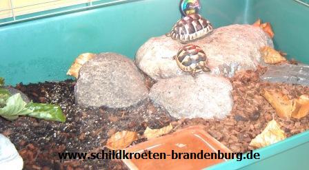 Zwei solche Schildkröten werden beispielsweise in einem Terrarium von 100 x 50 x 50 cm gehalten. Laut Mindesthaltungsbedingungen wäre dies rein theoretisch betrachtet ausreichend… jedoch nur für wenige Monate. Da mir selbst diese Mindesthaltungsbedingungen viel zu gering sind, lehne ich eine grundlegende und dauerhafte Haltung von europäischen Schildkröten im Terrarium ab! Sie gehören einfach ins Freiland.
