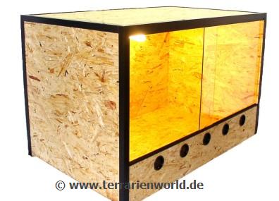 Alternativ kann man ein Terrarium auch aus Siebdruckplatten oder Karosserie-/Fahrzeugbau- platten (erhältlich im “Bauhaus“, Internet oder ebay). Siebdruckplatten haben den Vorteil, dass sie sehr witterungsbeständig (Feuchtigkeit), versiegelt und aus verleimten Sperrholz bestehen. Hier beginnt der m² -Preis bei ca. 15 €, je nach Stärke. Diese Platten sind allerdings sehr langlebig und werden gern von Schildkrötenhaltern verwendet.