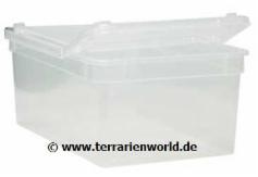 Für Schlüpflinge oder kleine Tiere, die nur kurzzeitig untergebracht werden müssen, eignen sich auch sämtliche Behältnisse aus PVC, wie z. B. Stapelkisten, Euroboxen oder Mörtelwannen. Sie müssen nur hoch genug sein, damit die Tiere diese nicht überkletten können und die Technik noch befestigt werden kann. Sie haben den Vorteil, dass sie schnell hin und her getragen werden können, z. B. bei Sonnenschein auf die Terrasse, Balkon oder bei der Vorbereitung zur Winterstarre in einen kühleren Raum. Die Schildkröten werden hierbei nicht unnötig gestresst. PVC-Behälter lassen sich außerdem wunderbar einfach reinigen, desinfizieren, sind oft stapelbar und kosten dazu nur ca. 10 – 30 € (je nach Größe).